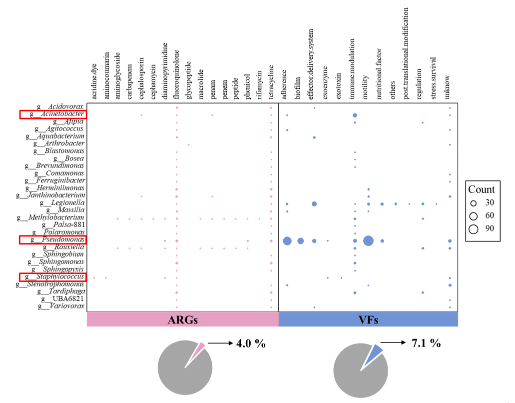 科研团队进一步利用宏基因组技术分析了冰川生境中耐药菌的分布特征,发现冰川耐药菌大多携带多种抗性基因,其中携带四环素—氟喹诺酮类抗性基因组合的冰川耐药菌数量最多(图3)。对冰川耐药菌潜在致病风险的分析结果显示,28个属中的细菌同时携带了抗性基因和毒力因子(图4),这些耐药菌对人类健康存在较大风险。