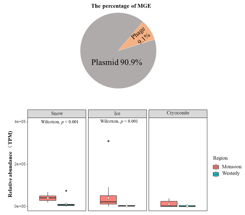 科研人员进一步识别了抗性基因在冰川生境中的传播媒介,发现质粒是冰川生境的优势移动遗传元件(图5)。由于移动遗传元件的丰度与抗性基因水平转移发生的概率存在关联,季风影响区冰川中移动遗传元件丰度较高,表明抗性基因在该区域的传播扩散风险高于西风影响区冰川。