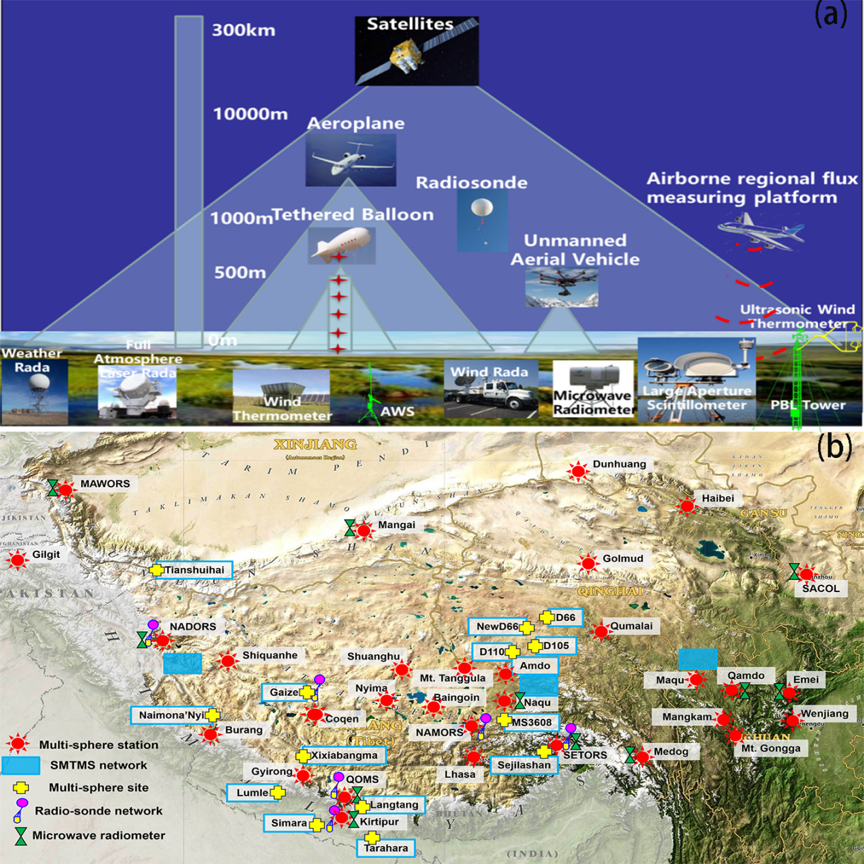 (a)青藏高原地气相互作用过程和大气边界层过程监测仪器垂直分布概况;(b)青藏高原地气相互作用过程和大气边界层过程综合观测研究站点分布情况