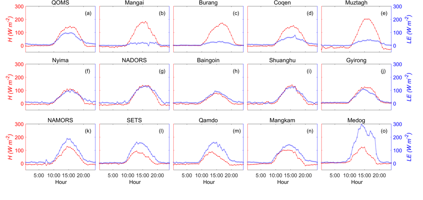 图2 第三极环境三维综合观测研究平台15个综合观测研究站2021年9月份平均的感热和潜热变化特征