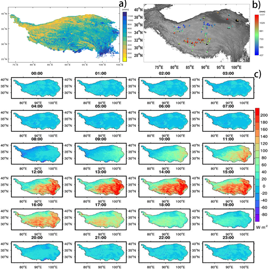 图3 青藏高原陆面蒸散发(ET)分布(a)、75个大湖年蒸发总量(b)以及2008年平均的潜热通量日变化特征(c)