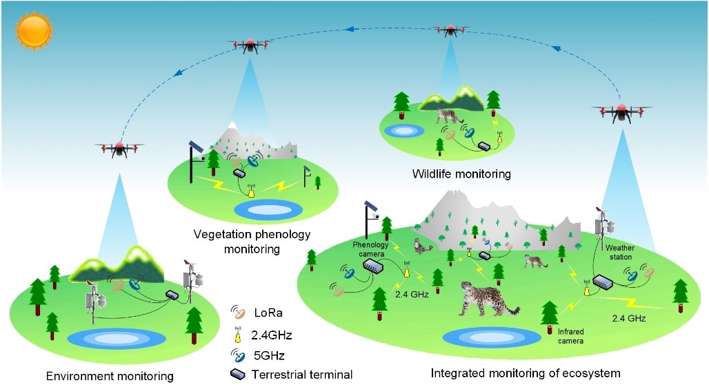 针对这一问题,中国科学院青藏高原研究所李新研究员联合兰州理工大学、兰州大学、中国科学院西北生态环境资源研究院等单位研究人员协同攻关,在前期研发的无人机物联网中继系统的基础上,研发出传输速率更高的无人机物联网中继设备,基本实现了图像、视频等大体量监测数据的远程传输,该研究将对青藏高原等极端区域生态系统监测和监测数据的高效传输具有重要意义。