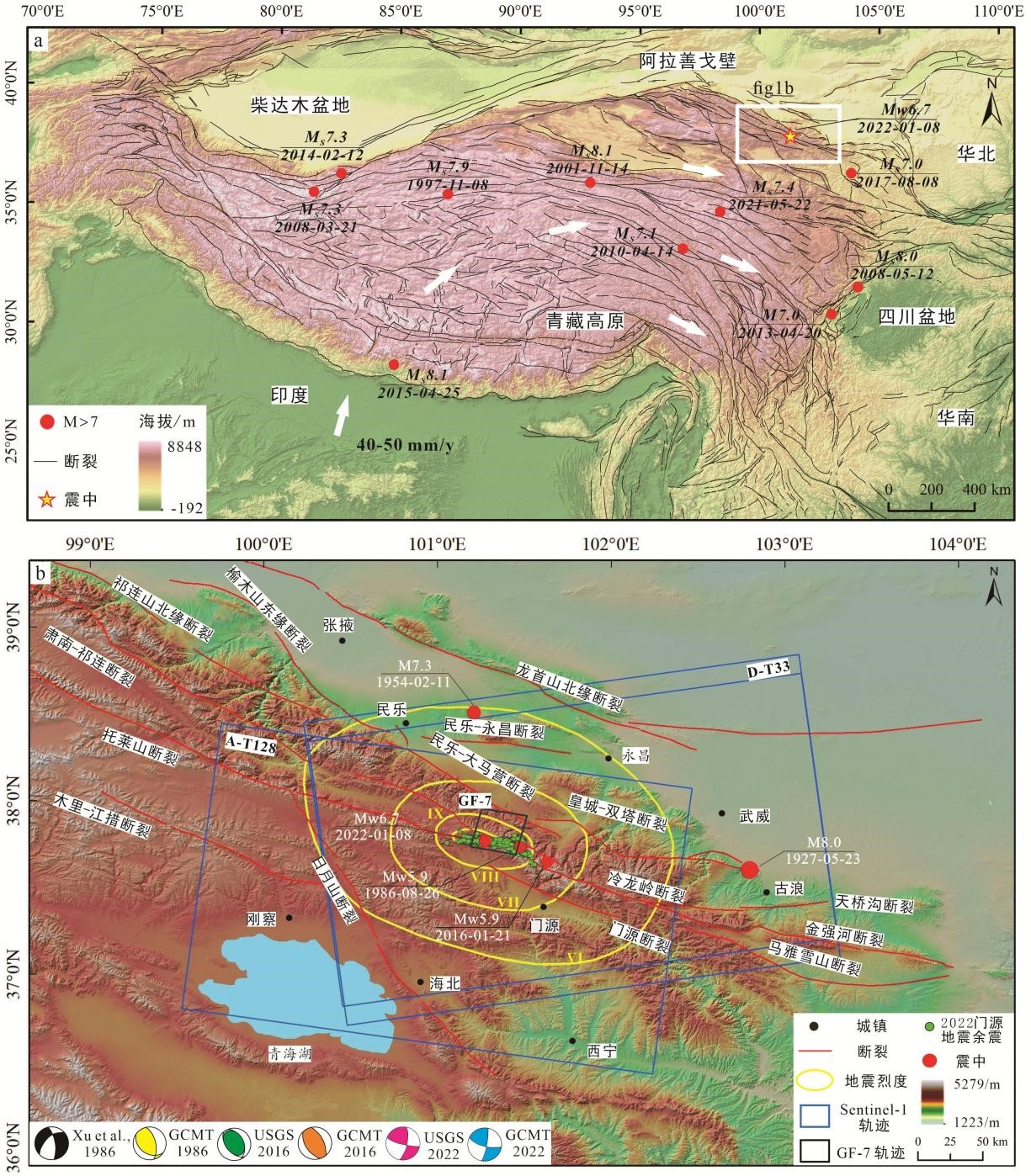 祁连山断裂带是青藏高原东北部最活跃的断裂带之一,特别是海原断裂带,历史上曾发生过多次7-8级(矩震级,Mw)的破坏性地震。2022年1月8日,祁连山东北缘,青海省门源县发生6.7(矩震级,Mw)地震(图1)。在过去大约35年里,门源地区发生了三次~6(矩震级,Mw)地震,3次地震的发震断层主要位于海原断裂带的冷龙岭断裂带西段。