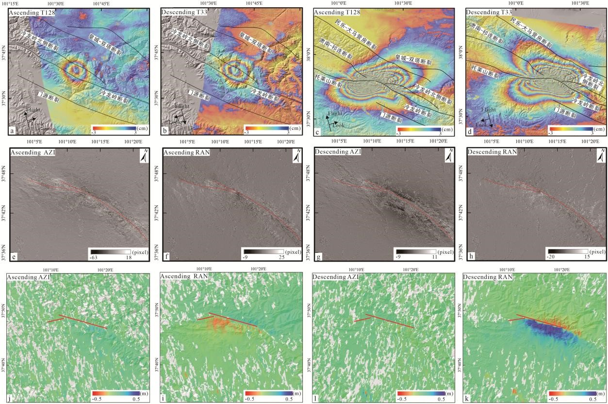 (a,b)2016年门源地震升、降轨同震形变场,(c,d)2022年门源地震同震形变场,(e,f)2022年门源地震升轨相位梯度(g,h),2022年门源地震降轨相位梯度,(j,i)2022年门源地震升轨POT结果,(l,k)2022年门源地震降轨POT结果