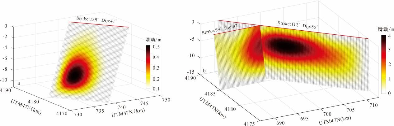 基于弹性位错理论、结合InSAR技术获得的同震形变场,研究团队对2016年和2022年门源地震的断层几何参数和断层滑动分布进行反演。反演结果表明(图3),2016年门源地震为一次逆断层事件,视线向最大同震地表形变约8cm,发震断层的走向、倾角和滑动角分别为139°、41°和78°,最大滑移量约0.6m,位于地下约8km,发震断层为冷龙岭北侧断裂。GF-7卫星影像解译结果进一步表明,2022年门源地震的地表断裂带表现为左旋走滑特征,地表破裂带沿北西西-南东东向分布。同震形变场视线向最大同震地表形变约72cm,主要发震断层为冷龙岭断裂西段,同时引起托莱山断裂东段的破裂。发震断层的走向、倾角和滑动角分别为112°、85°和3°,最大滑移量约4m,位于地下约4km。