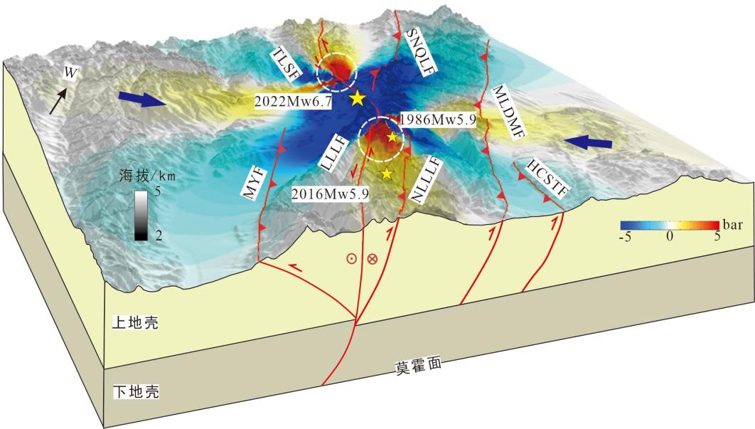 通过计算门源地区3次地震的库仑应力发现,1986年和2016年门源的库仑应力变化对冷龙岭断裂和冷龙岭北侧断裂产生了作用,1986年和2016年门源地震产生的库仑应力变化超过0.1巴(压强单位,bar)。作者以2022年门源地震发震断层为源断层,冷龙岭断裂为接收断层计算区域库仑应力变化(图5),发现2022年门源地震对冷龙岭断裂、冷龙岭北侧断裂、托莱山断裂、民乐-大马营断裂、门源断裂、肃南-祁连断裂都产生不同程度的影响,其中对冷龙岭断裂和托莱山断裂造成正库仑应力超过2巴(图5白色虚线圆圈区域)。