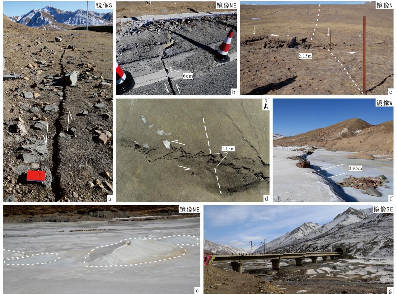 (a)地裂缝,左旋走滑,(b)公路左旋位错,(c)冰面挤压鼓包,(d)地表左旋位错,伴有张裂隙,(e)栅栏左旋位错,(f)冰面陡坎,(g)铁路桥面向东翻转
