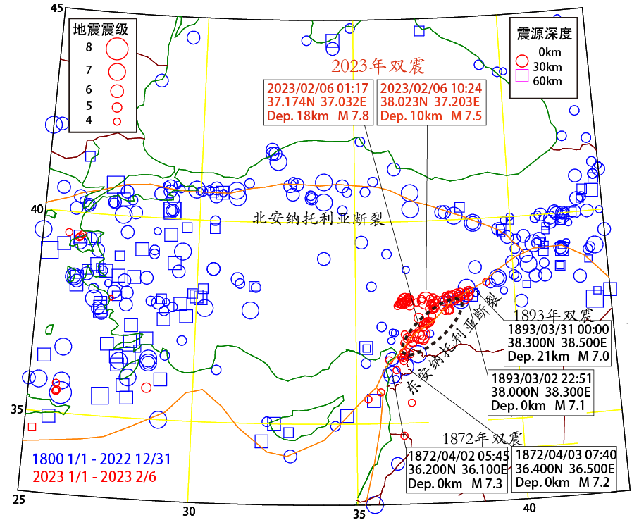 图2 研究区域构造背景、断层分布、1800-2022年间的地震分布(蓝色、来自美国地质调查局地震目录和Utsu,2002)和2023年土耳其地震序列的分布(红色,来自欧洲-地中海地震中心地震目录)。方框分别表示1872、1893年和2023年双震序列的震源参数。黑色虚线椭圆表示东安纳托利亚断裂带历史地震活动“空区”。图片修改自Seis-PC软件(Ishikawa, 1986)。