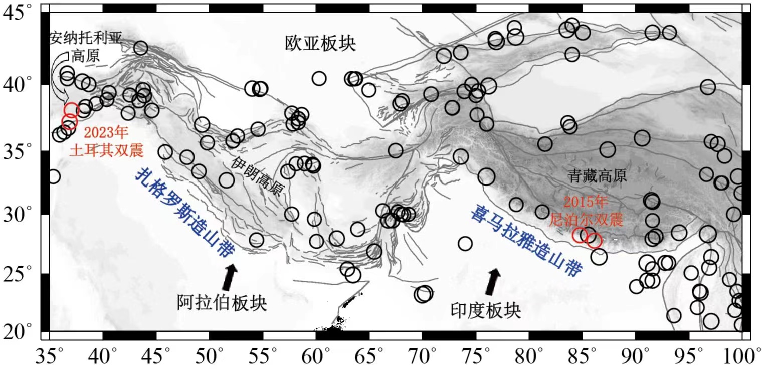 图1 灰色曲线表示扎格罗斯-喜马拉雅造山带活动断裂构造背景(Deng et al., 2003; Nissen et al., 2011)。圆圈表示1800年以来7级以上大地震的分布(Utsu,2002)。箭头表示阿拉伯板块和印度板块相对于欧亚板块的北北东向运动方向。