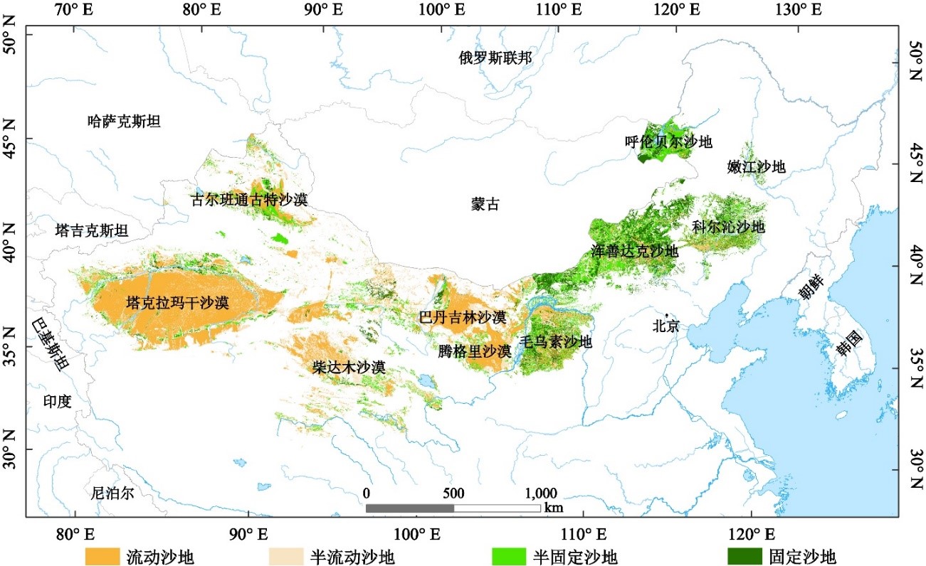 图1 中国荒漠和潜在荒漠化地区分布和沙漠、沙地景观的空间分布