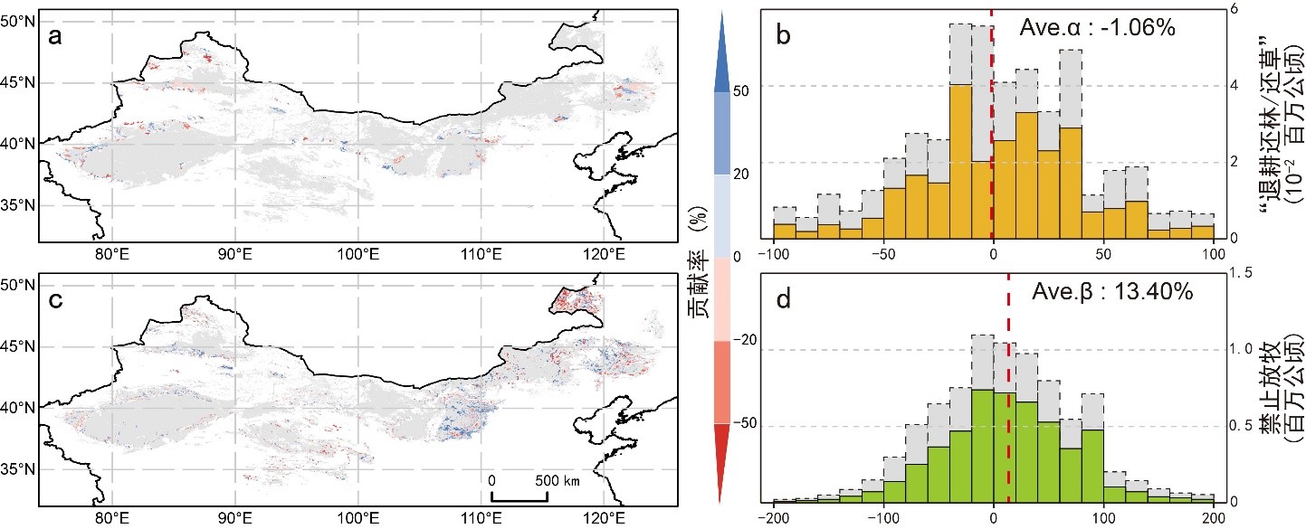 图2 我国荒漠及潜在荒漠化地区“退耕还林/还草”(a, b)和禁牧(c, d)工程实施以来,对植被恢复的空间分布(a,c,蓝色为促进植被恢复)及其贡献(b,d,其x轴对应于(a)和(c)中贡献率的数值分布)