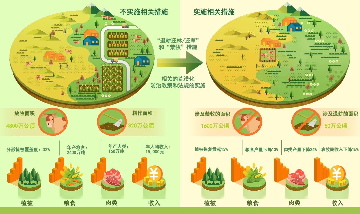 图3 潜在荒漠化地区实施“退耕还林/还草”和草场禁牧措施后植被覆盖度、粮食以及肉类产量的变化对比