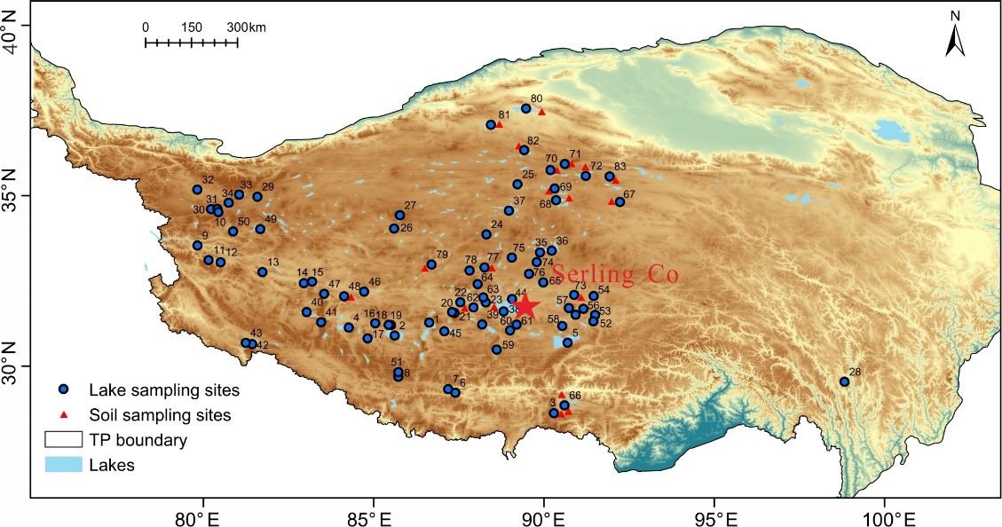 为此,中科院青藏高原所朱立平研究员带领湖泊与环境变化团队采集了青藏高原83个湖泊的表层沉积物和22个流域表层土壤样品(图1),细致分析了样品中古菌类异戊二烯型GDGTs(isoGDGTs)和细菌支链型GDGTs(brGDGTs)的分布情况,并结合多种湖泊环境参数(包括湖泊面积、水深、温度、pH、盐度、溶解氧及叶绿素浓度等)系统评估了其来源、环境响应及相关代用指标的古环境适用性,同时定量重建了色林错25.1 cal kyr BP以来的湖泊水位。