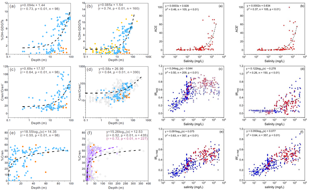 图2 古菌GDGTs对湖泊水深的响应(左)及细菌GDGTs对盐度的响应(右)