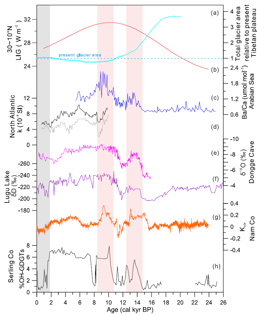 古环境重建结果表明,色林错经历了末次冰盛期的低湖面期、末次冰消期的剧烈波动期以及全新世相对高湖面期三个阶段,其水文演化历史与周边已有古气候记录具有较好一致性,表现出印度季风的共同驱动作用(图3)。此外,该研究强调了长期降水-蒸发平衡对湖泊水位变化的重要影响,气候事件通过打破这种平衡影响湖泊水位。本研究提供了青藏高原中部首条较长时间尺度连续的古水文定量记录,阐明了气候变化在该地区水文演变过程中的作用和机制,可为研究青藏高原西风-季风相互作用下的水文演变提供参考。