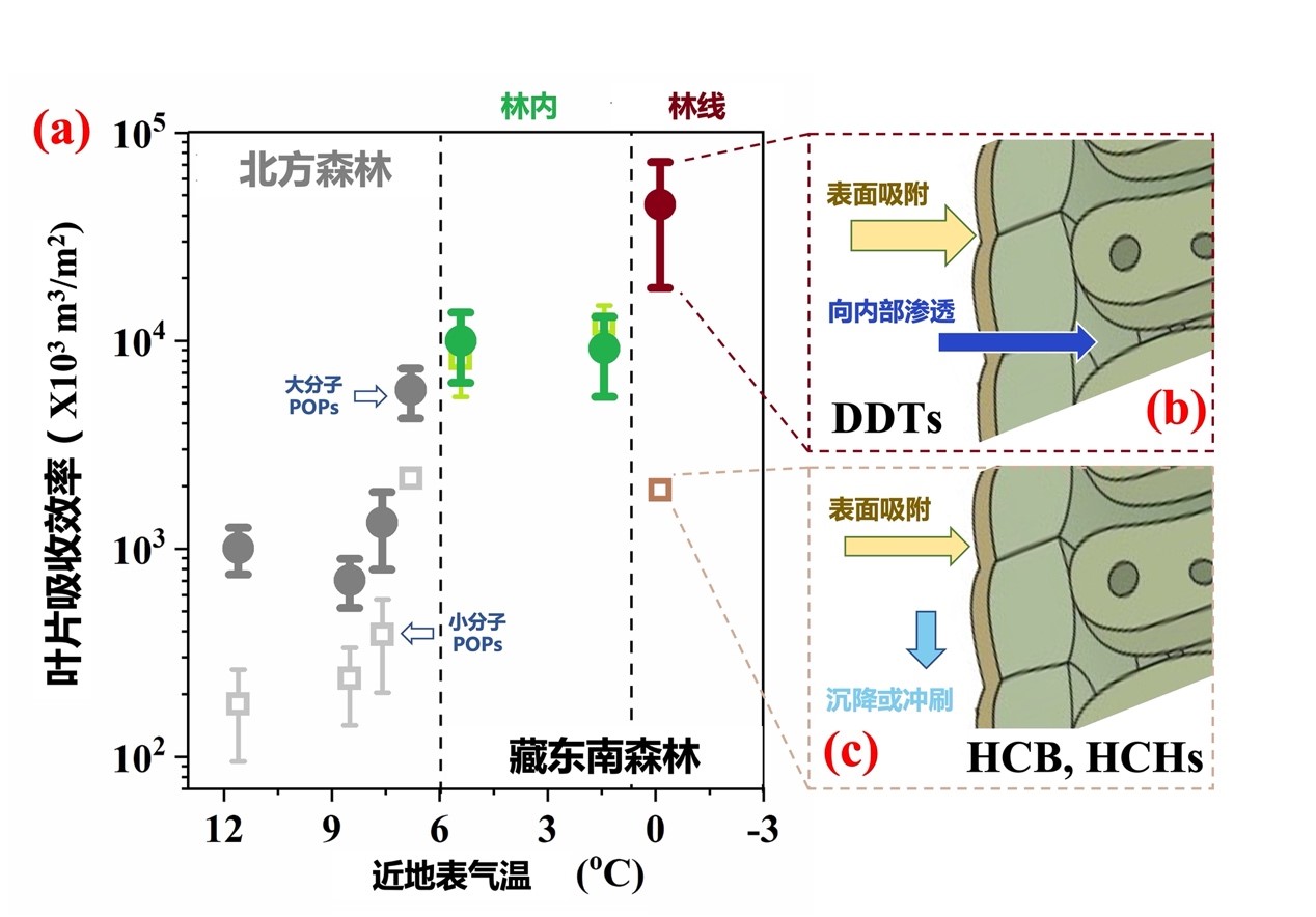 中科院青藏高原所高寒环境质量与安全团队选择藏东南地区高山林线叶片为研究对象,开展了生长季叶片POPs吸收动力的连续观测,研究低温地区叶片POPs吸收机制。通过长期观测发现,藏东南地区高山林线叶片对大分子POPs的吸收效率相较高原林内叶片及欧洲北方森林叶片高约1个数量级,是目前已知的全球吸收效率最高的地区(图1a)。大分子POPs(如滴滴涕DDTs)在展叶早期首先吸附于叶片蜡质表层,再缓慢渗透到叶片内部并在生长季末期达到吸收效率峰值(图1b)。低温和厚蜡质是控制林线叶片吸收大分子POPs的主要因素。然而,较高的大气相对湿度不利于叶片吸收大分子POPs,具体机理为高湿条件下,叶表面凝结的水汽阻挡大分子POPs接触叶蜡,堵塞了DDTs进入叶片的内部通道。