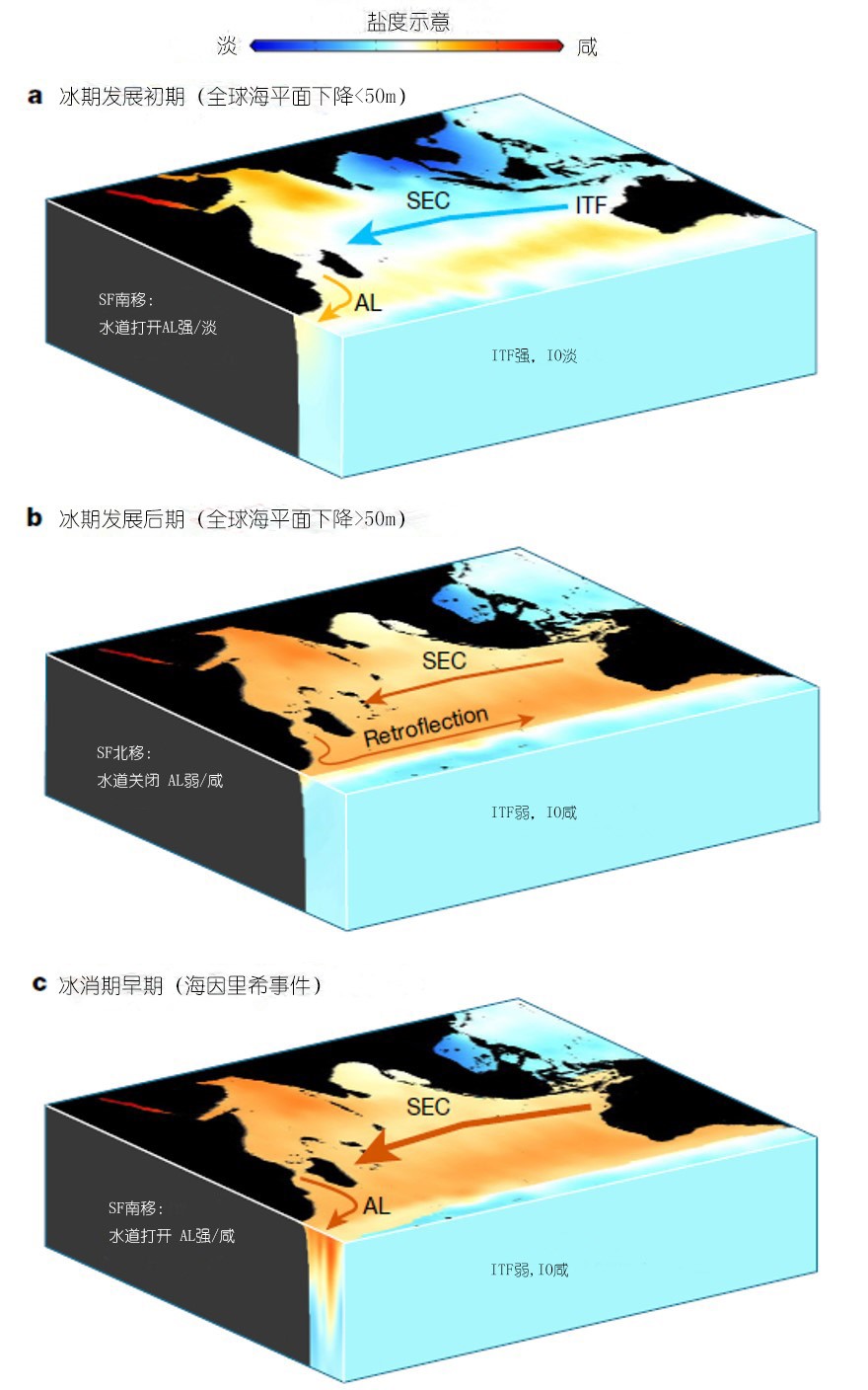海平面变化引起的印尼贯穿流、印度洋海表盐度以及厄加勒斯洋流之间的协同演变 SEC: 南赤道流;AL: 阿古拉斯泄漏;ITF: 印尼贯穿流;IO:印度洋;Retroflection: 回流a, 在冰期发展的初期(全球海平面下降不超过50米时),印度尼西亚群岛大半位于海平面之下,生成了较强的印尼贯穿流(Indonesian Through Flow,ITF),并沿着南赤道暖流(South Equator Current, SEC)将来自太平洋的淡水带入印度洋。此时非洲南部亚热带锋面(Subtropical Front,SF)位置偏南,厄加勒斯泄漏(Agulhas Leakage,AL)强度适中。b, 在冰期发展的后期(全球海平面下降超50米),印度尼西亚群岛附近海域面积大量减少,导致ITF减弱,减少进入印度洋的淡水。同时, SF向北移动导致AL减弱。c,冰消期初期,由于印度尼西亚群岛附近陆地仍然暴露在外(全球平均海平面仍比当前要低50米以上),ITF仍然较弱。然而,SF向南移动导致AL的恢复,从而将印度洋的高盐水释放到南大西洋。