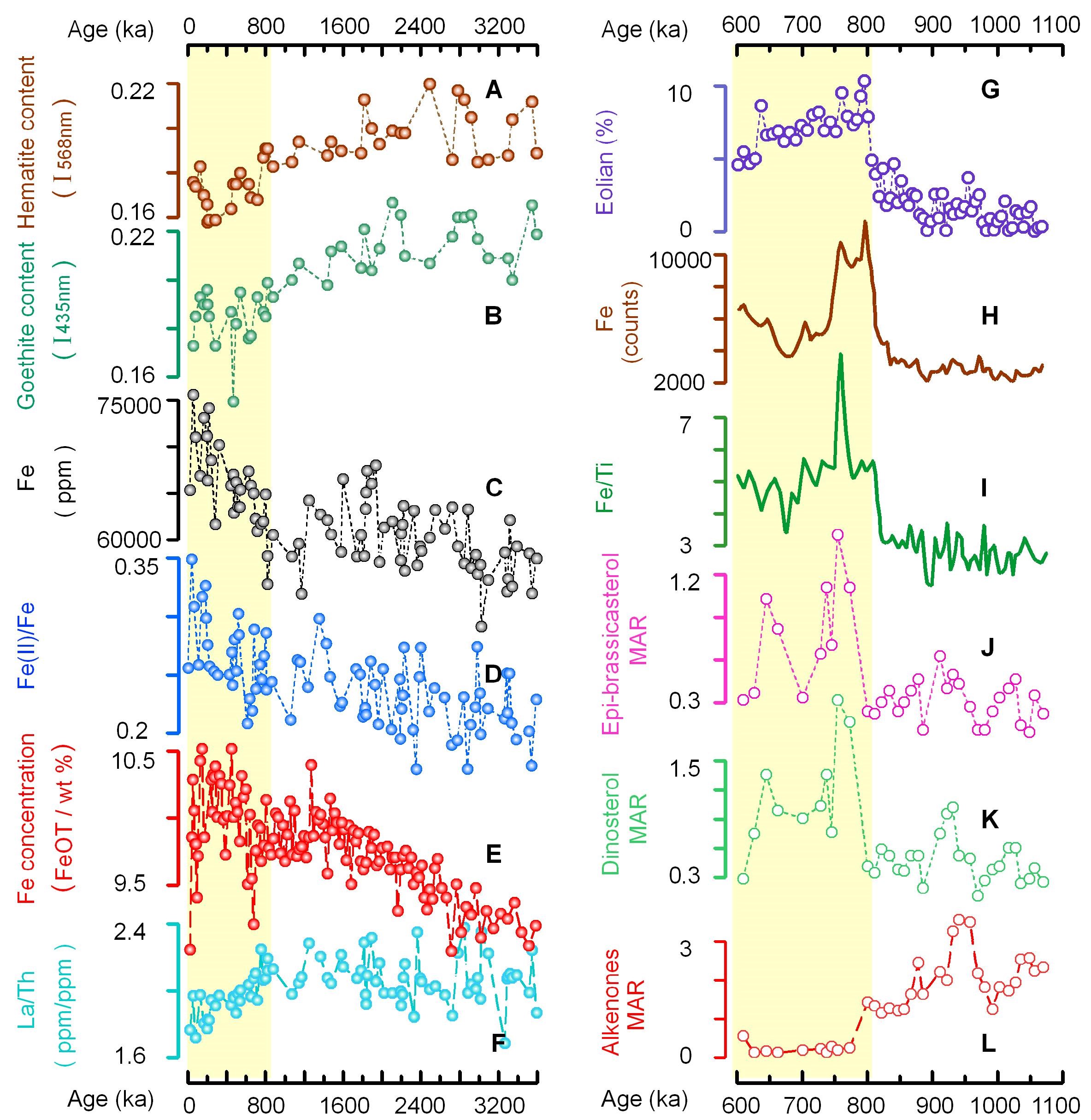 图2 塔里木沙尘(<5微米)360万年以来铁化学形态组成(A-D)及其与赤道太平洋PC932孔生物记录的对比(G-L)