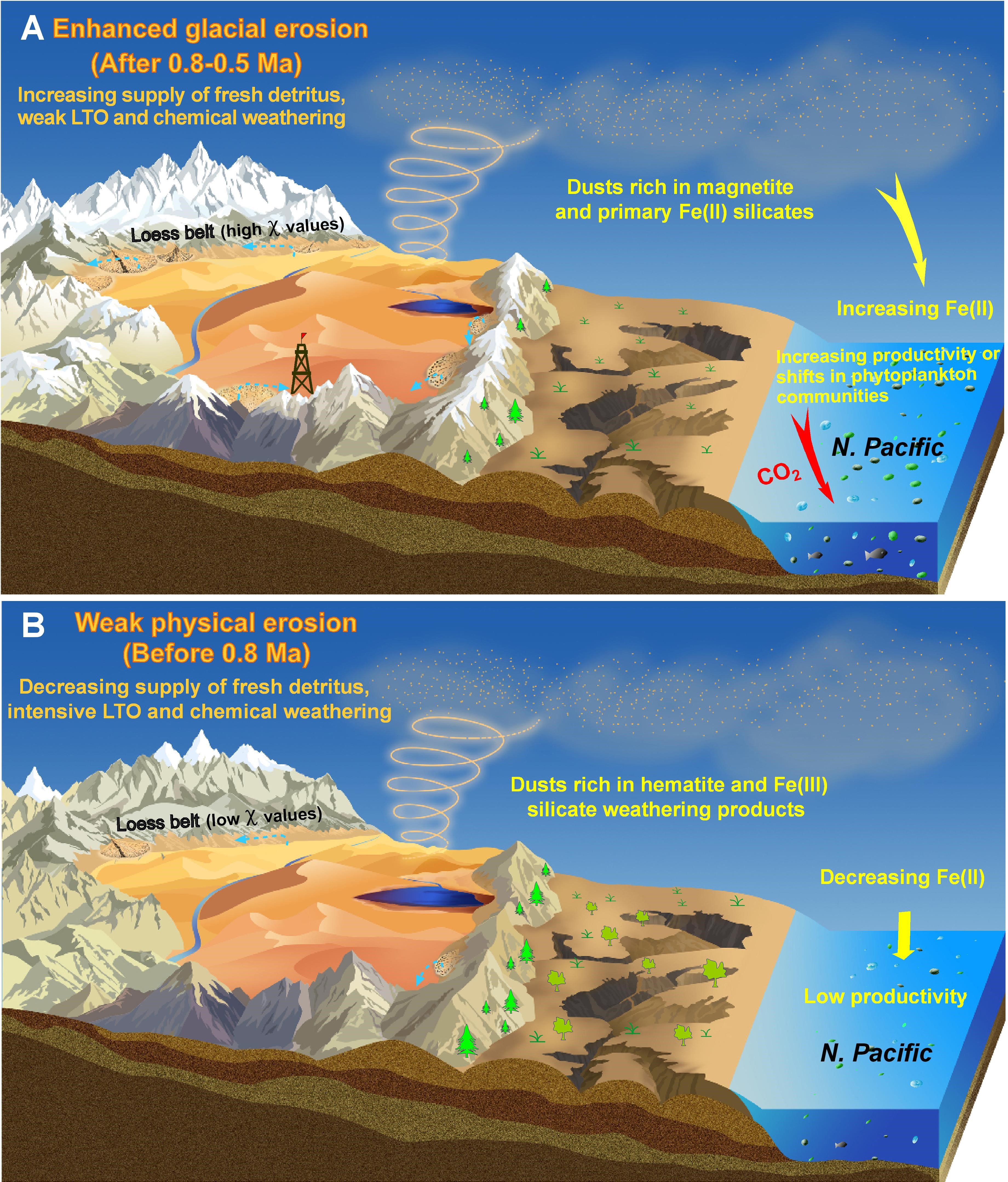 研究团队通过研究西昆仑山黄土古粉尘序列样品以及小于5微米黄土颗粒组分的铁氧化物种类和含量,进一步发现在中更新世转型期(约80万年)开始,随着全球变冷以及北半球中高纬地区山地冰川的急剧增加,青藏高原的冰川侵蚀作用显著增强,导致塔里木粉尘铁氧化物突然从赤铁矿(Fe3+)转变为磁铁矿(Fe2+和Fe3+),同时铁元素总含量和高生物活性的二价铁含量急剧增加。计算结果表明,中更新世气候转型期以后,亚洲内陆干旱区输送至北太平洋的铁元素总含量以及二价铁通量分别增加了约70%和约120%,极大促进了北太平洋生物物质的繁盛,并可能改变了浮游植物种群结构,大量消耗了大气中二氧化碳,造成全球气候进一步变冷。