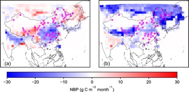 图1 新增站点位置(空心圆)和生长季(a:春季;b:夏季)陆地碳汇