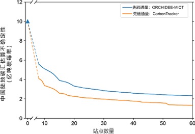 研究结果表明,在现有站点基础上,亟需在植被生长季生产力较高的东南、东北、华北和青藏高原地区增设CO2观测站点(图1)。若在我国建设30个观测站点,可将碳汇估算的不确定性从10亿吨碳每年降低至3亿吨碳每年;建设60个观测站点,可将不确定性进一步降低至2亿吨碳每年(图2蓝色曲线)。研究人员还进一步证明该观测网络具有广泛适用性,当反演使用不同输入和配置时,该观测网络仍对中国碳汇有较高的估算精度(图2橙色曲线)。