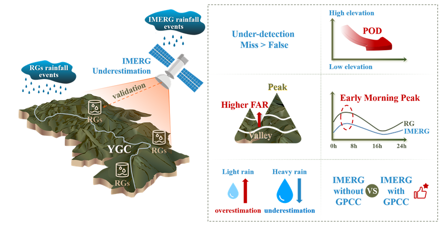 自2018年起,中国科学院青藏高原研究所地气作用与气候效应团队依托第二次青藏高原综合科学考察研究任务,在雅鲁藏布大峡谷水汽通道地区建立了由22个雨量筒观测站组成的复杂山地降水观测网络。目前,研究团队收集了该观测网近5年连续的降水观测数据,并使用这些地面观测数据全面评估了全球降水观测GPM计划的IMERG降水产品在雅鲁藏布大峡谷水汽通道地区的适用性,深入探究了复杂山地地区卫星遥感反演降水面临的挑战。研究结果表明:(1)IMERG数据系统地低估了雅鲁藏布大峡谷地区的总降雨量。特别是,IMERG对降雨事件的探测能力不足,漏报现象比误报现象更为显著;(2)卫星探测降水事件的能力随着海拔升高而降低,导致高海拔地区降雨事件的低估更为严重;(3)相较于山峰地区,山谷里发生降雨事件误报的概率更高;(4)通过分析IMERG正确命中降雨事件,发现IMERG对降雨量的低估仍然存在,且存在对小雨高估和对大雨低估的问题;(5)IMERG能够捕捉到大峡谷地区凌晨的降水峰值,但对日变化的幅度存在低估;(6)尽管IMERG算法采用全球降水气候中心(GPCC)资料对GPM的降水估算进行校准,该校准对IMERG传感器层面降水低估的问题有所改善,这一研究不仅填补了复杂山区卫星降水验证的空白,还为使用卫星遥感降水数据的用户和算法开发者提供了重要的参考建议。
