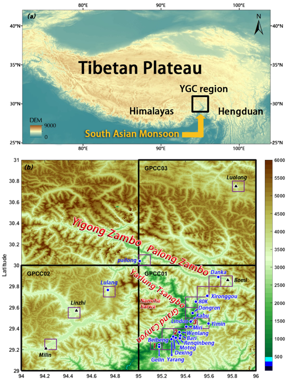 雅鲁藏布大峡谷位于青藏高原东南部,是世界上最深峡谷之一,也是南亚季风输送水汽到青藏高原的主要通道之一。受自然条件限制,该区域缺乏长期降水观测资料,严重制约了开展本地区水汽输送相关研究。尽管卫星反演的降水数据为青藏高原山地地区的水和能量循环提供了重要替代数据,但该区域具体表现如何尚未知。