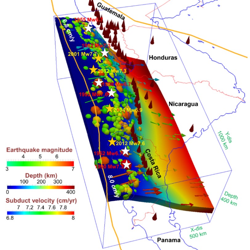 俯冲带是地球内部圈层与外部圈层之间进行物质循环和能量交换的关键地带,通常孕育有大量的地震活动。中美洲俯冲带位于科科斯-纳斯卡扩张中心(图1),具有丰富的地震活动,特别是频繁发生的慢地震,长期被视为当前地球科学研究的前沿和热点。与普通地震快速破裂的方式不同,慢地震的特点是缓慢释放能量,持续时间可能从几周到数月。为了进一步查明中美洲俯冲带地震的破裂机制,中国科学院青藏高原研究所碰撞隆升及影响团队季颖锋研究员等基于俯冲带的三维几何形状数据(Slab2.0模型)、板块相对位移速度数据(MORVEL)和海底板块年龄数据(EarthByte),运用三维俯冲数值模型,重新模拟了中美洲俯冲带的温度结构,获得了俯冲板块三维脱水区分布结果。