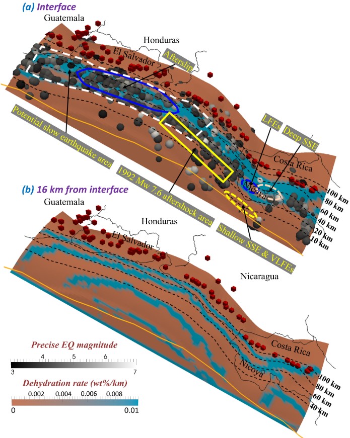研究结果表明,科科斯板块表面温度较过去学术界认为的更高。在此情形下,俯冲带内的脱水反应导致更多流体释放,增加孔隙流体压力,促使中美洲俯冲带快慢地震的重复发生。这一发现为解释中美洲地震分布特点提供了重要参考。此外,研究团队预测,中美洲危地马拉至尼加拉瓜沿海区域也具有发生慢地震的可能性,是未来预警和预防慢地震的关键区域。