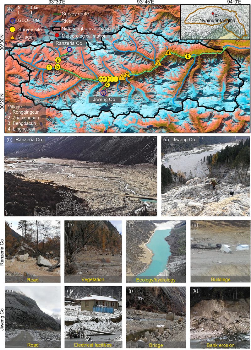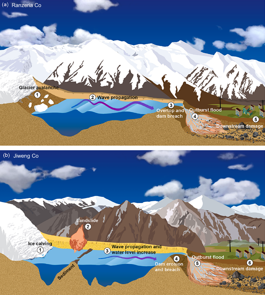 冰湖溃决洪水(Glacial Lake Outburst Flood, GLOF)是高山地区的主要自然灾害之一,具有突发性强、海拔落差大的特点,到达下游区域时往往会演变成大型泥石流,致使沿途基础设施和居民生命财产遭受惨重损失。位于青藏高原念青唐古拉山东段的尼都藏布流域,在过去十年里接连发生了两次GLOF事件(2013年然则日阿错溃决和2020年吉翁错溃决),洪水摧毁了当地道路、桥梁、通讯设施、牧场、民房等,造成经济损失达上亿元(图1),但这两起冰湖溃决链的成因和机制仍不清楚。