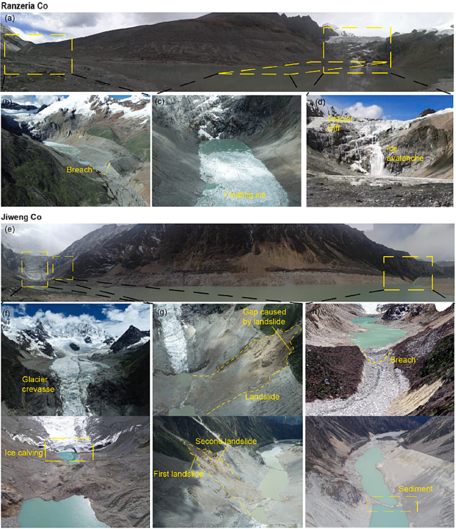 为加强对历史GLOF事件的成因和机制研究,评估区域冰湖危险性和溃决风险提供科学依据,中国科学院青藏高原研究所环境变化与多圈层过程团队张国庆研究员等综合运用卫星遥感、水文模型和野外实地考察,系统研究了然则日阿错、吉翁错这两个溃决冰湖的面积、水位和水量变化特征,以及溃决前后冰湖母冰川与侧碛地形变化,揭示了冰湖溃决的原因和机制,重建了下游洪水淹没的演进过程。