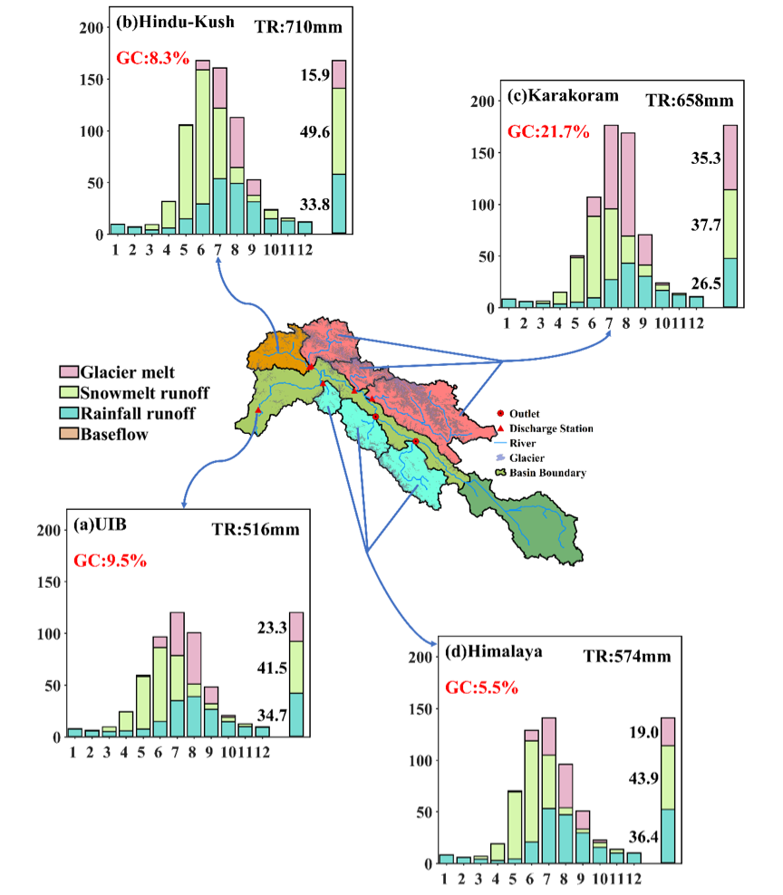 图1 印度河上游流域(a)及流域内三个山区(b-兴都库什、c-喀喇昆仑和d-喜马拉雅)历史时期的径流组分特征