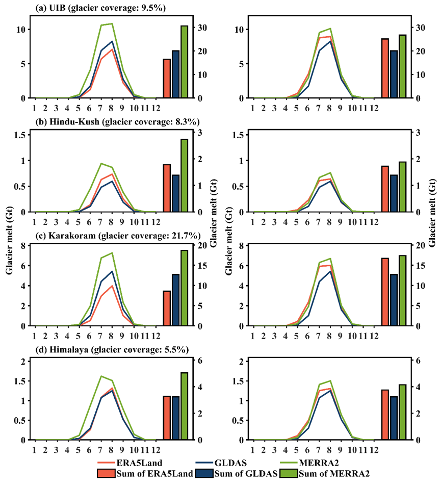 研究人员基于可靠的年降水估计,对比了多套降水数据产品后,选择最新的ERA5-Land降水数据作为模型输入。模拟结果表明,印度河上游流域径流主要受冰雪融水径流主导。近期冰川径流对总径流的贡献率为23.3%,融雪径流和降雨径流的贡献率分别为41.5%和34.7%;冰川径流对总径流的贡献同时受到流域冰川冰储量及降水量的影响,在印度河流域不同山区存在较大差异,冰川覆盖面积最广的喀喇昆仑地区冰川径流的贡献量可达35.3%,而在兴都库什山区为15.9% (图1)。此外,冰川覆盖流域的水文过程模拟对气温和太阳辐射数据的变化十分敏感(图2),气温和太阳辐射输入数据的差异显著改变了年内最大逐时冰川径流的峰值及其出现时间。除了降水输入外,温度和太阳辐射参数输入的准确性对于冰川覆盖区的流域洪水事件的模拟同样重要。