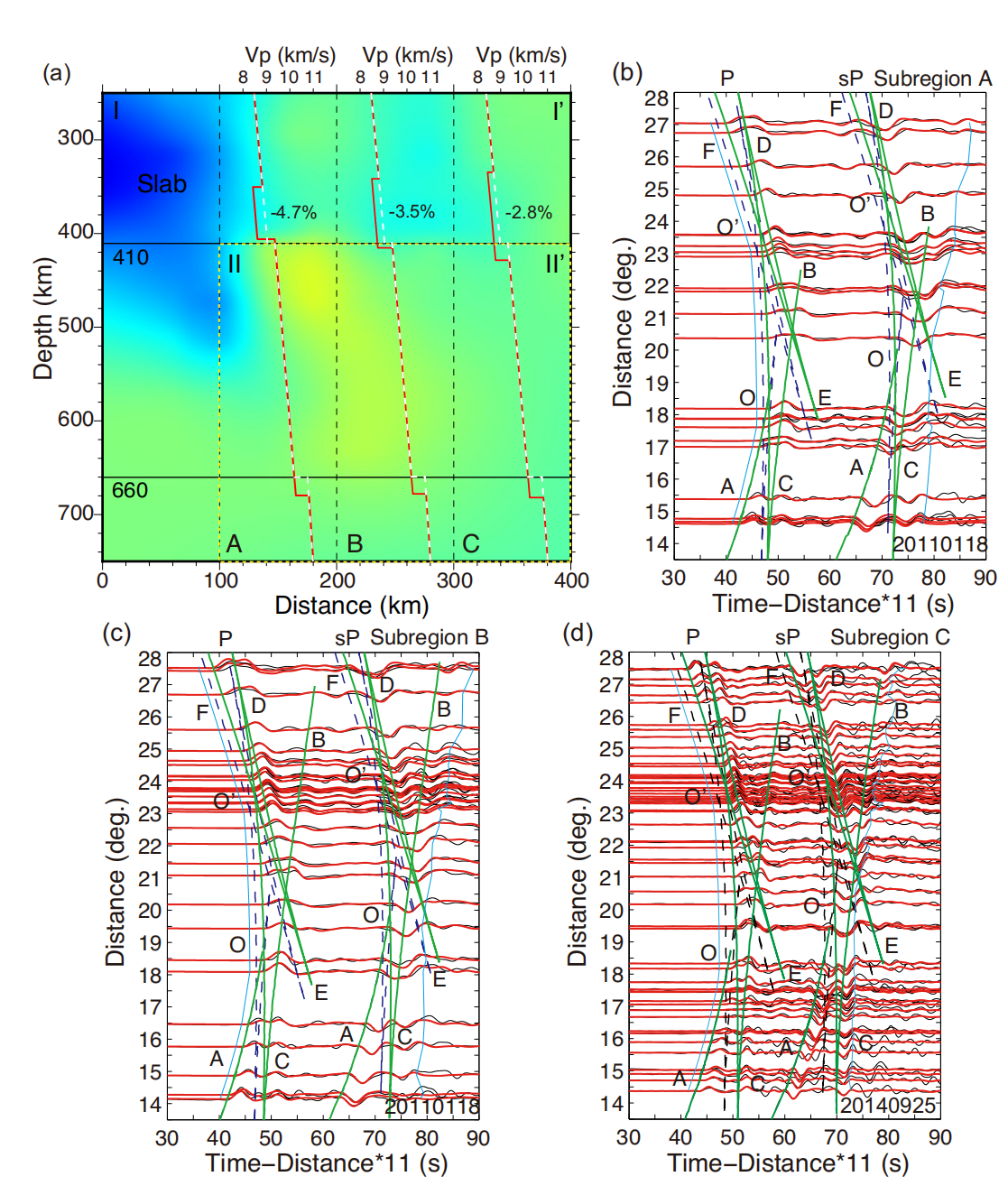 图2 (a) 3个分区最优P波速度模型;(b-d) 观测(黑线)与最优速度模型计算的理论(红线)三重震相波形