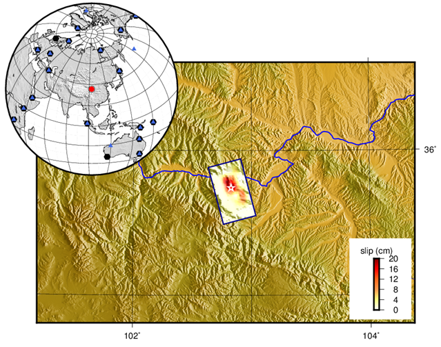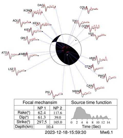 北京时间2023年12月18日23点59分(UTC 2023-12-18 15:39:30),甘肃省临夏州积石山县发生了M6.2级地震。地震发生后,中国科学院青藏高原研究所碰撞隆升及影响团队从国际地震学联合会(IRIS)数据中心下载了地震数据资料,研究了本次地震震源机制和震源破裂过程。团队选取信噪比较高并且沿方位角分布比较均匀的19个远场P波波形(震中距位于30 < <90 范围之内)和20个SH波波形资料反演点源模型的震源机制解,构建有限断层模型,反演震源过程,获得了本次地震破裂滑动分布的初步结果:计算得到的地震矩为1.55 1018Nm,Mw=6.06。最大滑动20厘米。