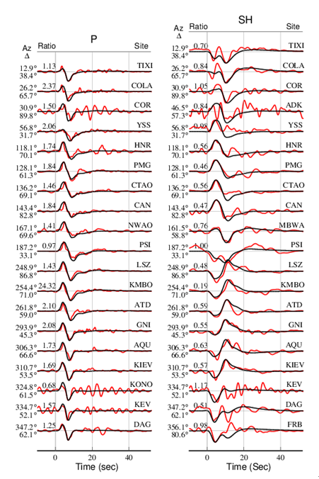 Comparison of observed (black) and synthetic waveforms (red) for P vertical components, and SH components are shown in the panel, the azimuth, epicentral distance, amplitude ratio and station name are also indicated.