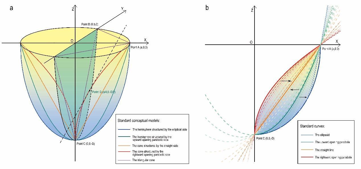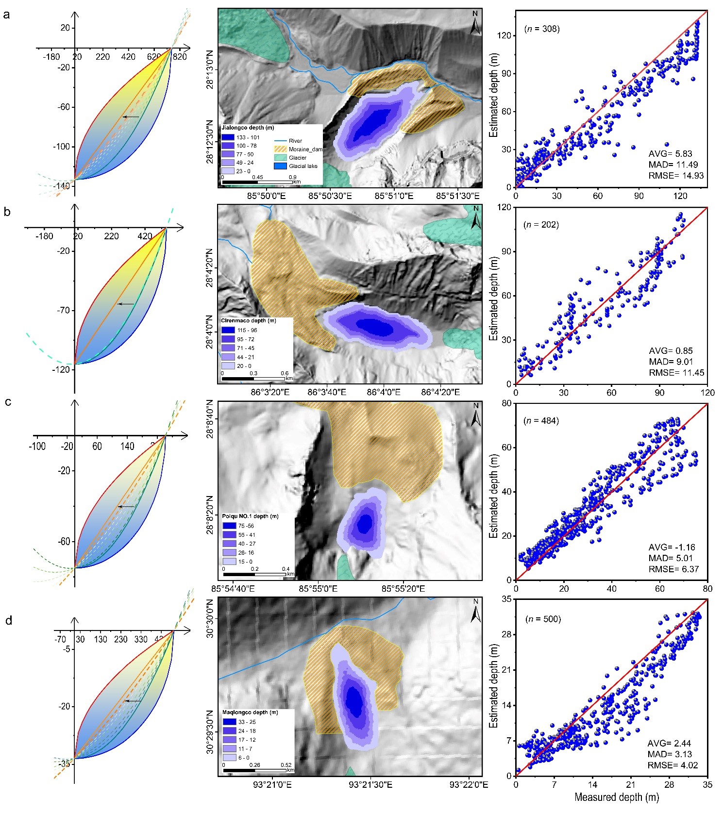 通过调查统计全球冰湖测深数据,研究冰湖体积-面积和面积-最大深度经验关系,科研人员进一步为冰坝湖、冰面湖、冰川末端接触湖等5种不同类型冰湖定义了9种不同的概念模型。首先找到描述冰湖湖盆最适用的概念模型,再将其嵌套到实际的冰湖形状中,估算得到湖盆内任意点的水深。通过实测点与模拟点的对比评估,一致认为基于几何近似法构建的冰湖水深分布概念模型具有较高适用性,从标准体嵌套到实际冰湖水深的过程中,产生的体积和水深误差在 10%左右。