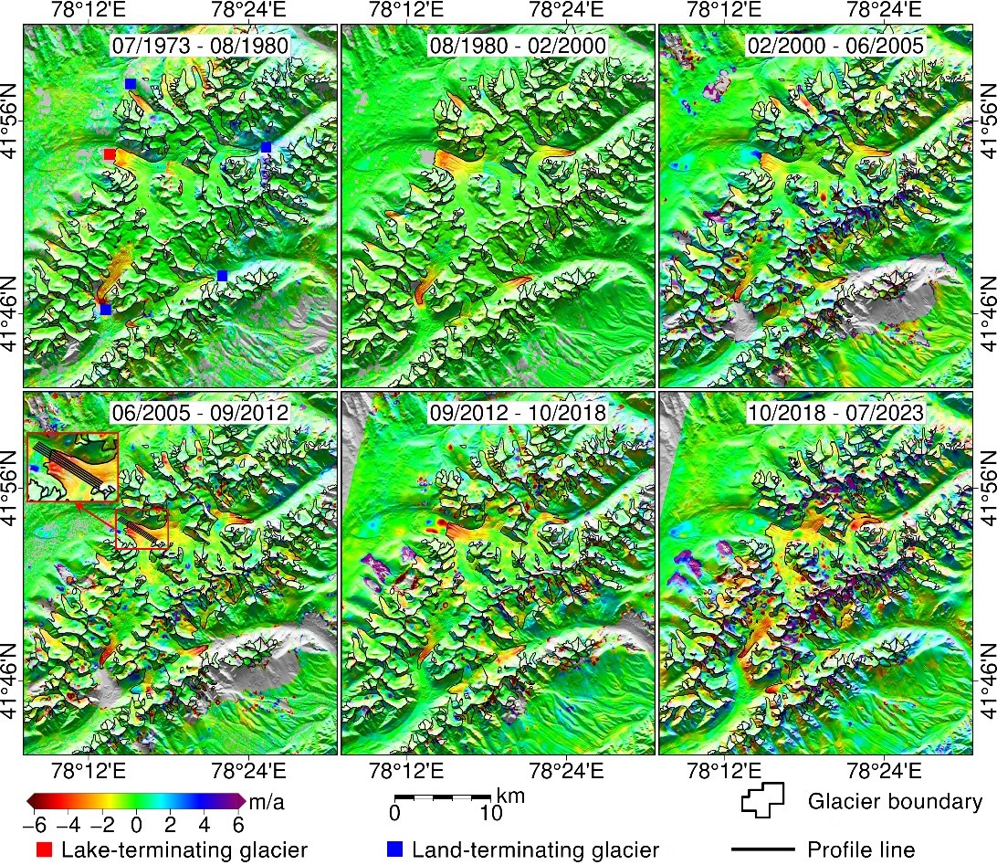 冰川是重要的固态水库,在区域水文循环中扮演着关键角色,特别是在降水稀少的干旱或半干旱地区。天山作为全球干旱区中最大的山脉之一,冰川融水在区域水资源配置中占有重要地位,深刻影响着周边地区的社会、经济及生态的可持续发展。在当前气候变化背景下,冰川的持续消融增加了冰前湖的不稳定性,给下游地区安全带来挑战。因此,研究天山冰川和冰前湖的长期变化对认识冰川与冰前湖演化过程、理解其相互作用机制和评估冰前湖溃决风险等具有重要意义。