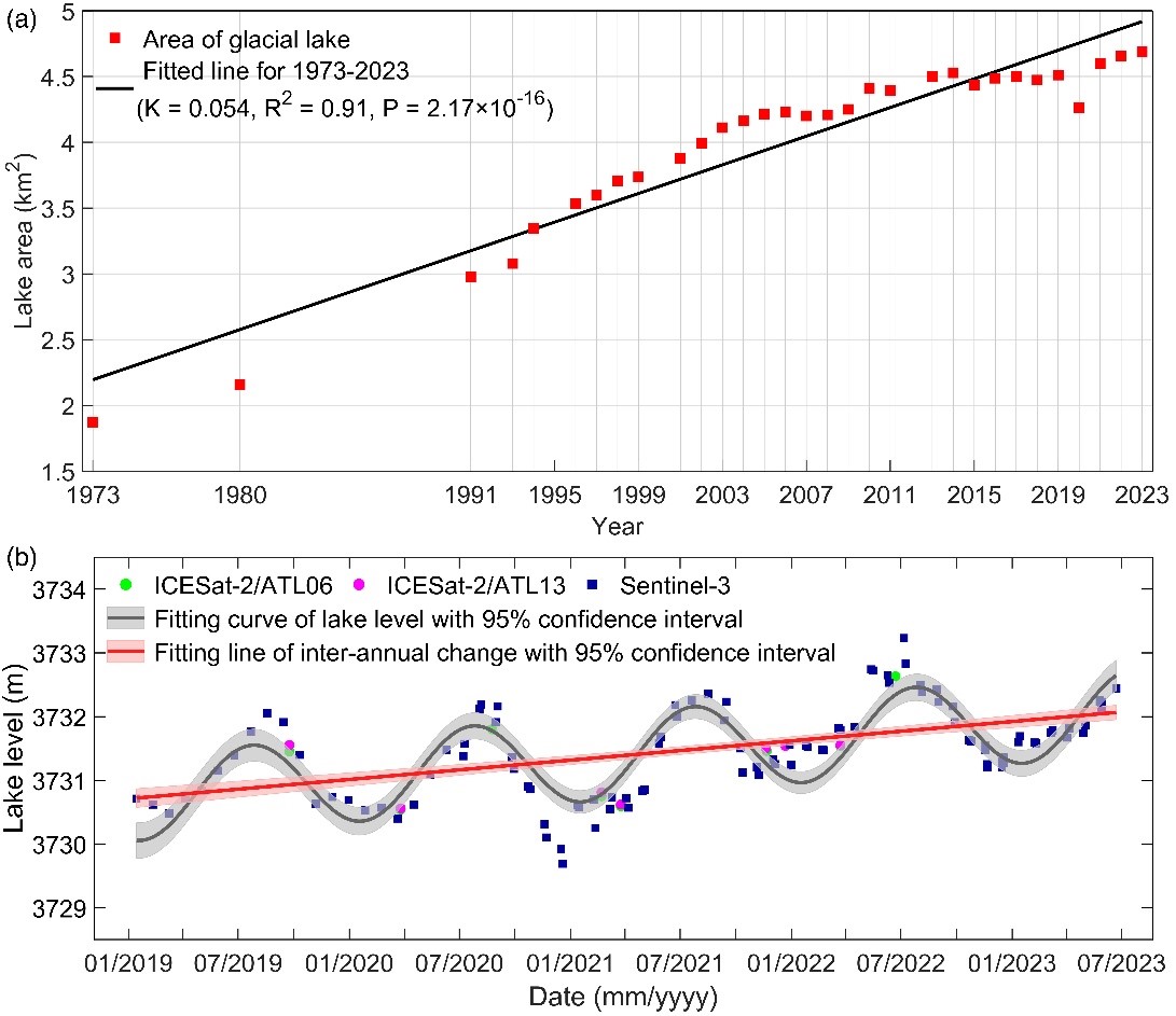 研究成果以“Glacier mass change and evolution of Petrov Lake in the Ak-Shyirak massif, central Tien Shan, from 1973 to 2023 using multisource satellite data”为题,发表于国际学术期刊Remote Sensing of Environment。兰州大学与我所联合培养的博士生汪赢政为第一作者,李新研究员和中南大学周玉杉副教授为共同通讯作者。本研究得到了国家重点研发计划(批准号:2021YFB3900105)和国家自然科学基金(批准号:42001381、42101406)的资助。