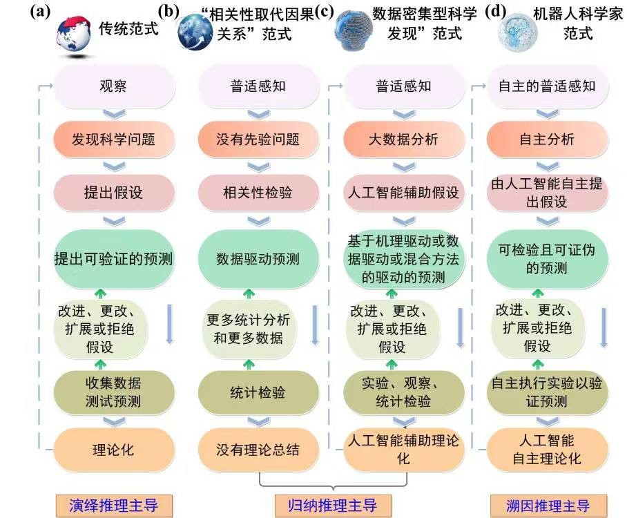 (a)传统范式 (b)“相关性取代因果关系”范式 (c)“数据密集型科学发现”范式 (d)机器人科学家范式