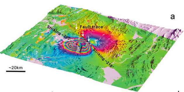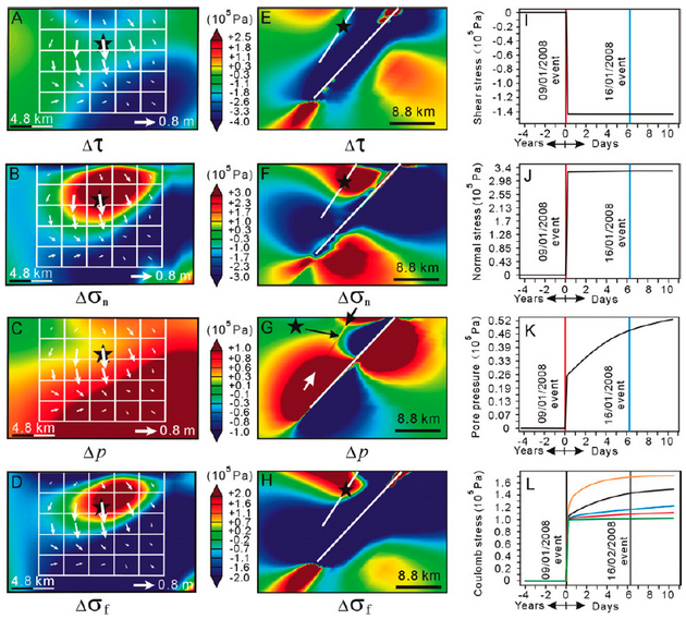研究首先根据欧洲航空航天局Envisat卫星的空间对地观测数据,用InSAR技术获取该地震序列在卫星视向上(LOS)的高精度地表变形。基此,反演得到了主地震(09/01/2008 Ms=6.4)和余震(16/01/2008 Ms=5.9)破裂的几何学与运动学。通过建立固体+流体(Biot’s solid)耦合求解的多物理场模型,模拟了地震发生后因流体运动所导致的近场库仑应力在时间上的变化,从而解释了尼玛地震序列中主地震对余震触发的动力学机制。