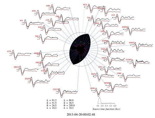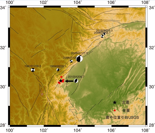 Figure 1 Focal mechanism of the Mw6.7 earthquake, Lushan, Yaan, China.