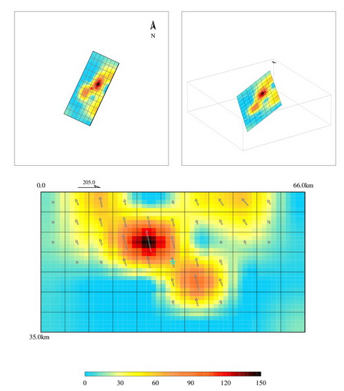 图中分别给出了有限断层模型的地表投影(左上)和三维示意图(右上)