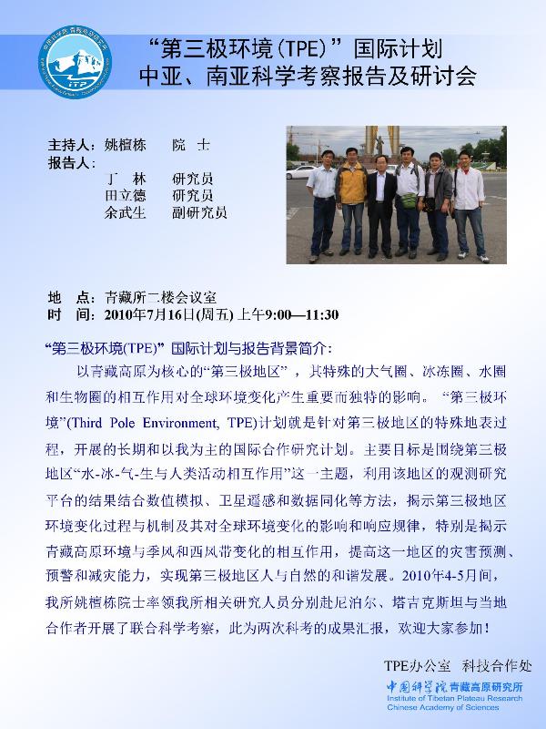 “第三极环境(TPE)”国际计划中亚、南亚科学考察报告及研讨会