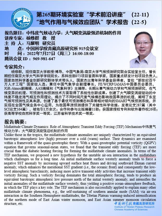 第265期环境实验室“地气作用与气候效应团队”学术报告(22-11)