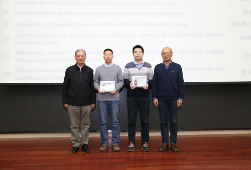 图1.《中国科学》、《科学通报》总主编朱作言院士和《Science Bulletin》主编王恩哥院士为梁尔源研究员(左二)颁发荣誉证书
