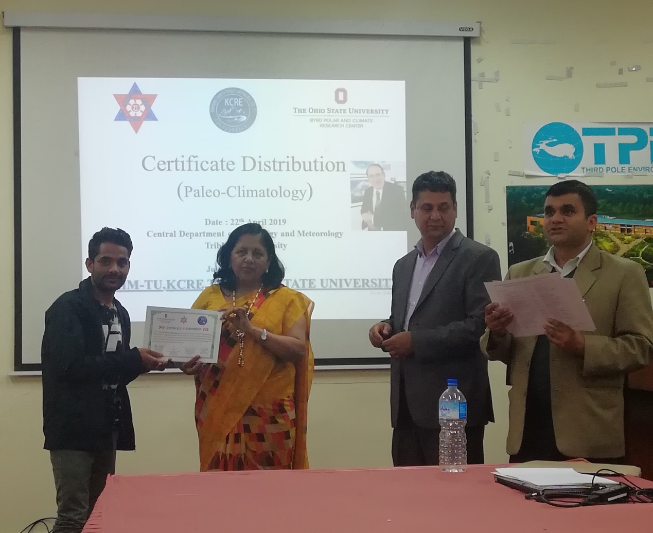 课程从2019年1月8日开始,历时3个月,24名特里布文大学学生参加了此次培训,4月22日加德满都中心举办结课证书颁发仪式,特里布文大学主管教育副校长Sudha Tripathi、水文气象系主任Deepak Aryal、加德满都中心副主任刘晓波、Binod Dawadi、主管徐田利出席仪式。