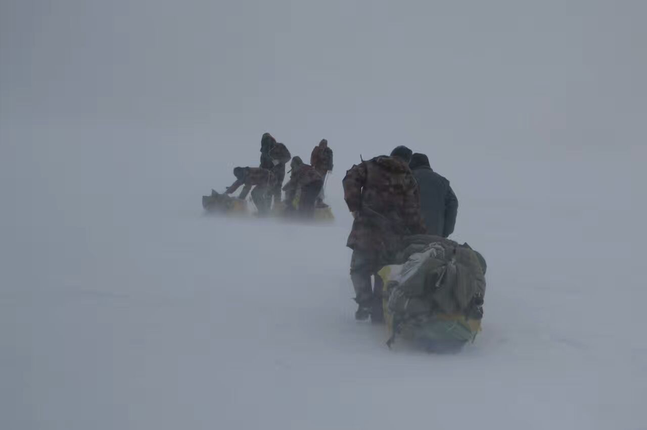 随着冰芯钻取工作的开展,科考人员们将精力腾挪出来开展一些其他方面的科学考察工作。高山自动气象站架设、布设冰川物质平衡测杆、采集表雪和雪坑样品、往下运输冰芯、采集岩石表层10Be样品等工作项目有条不紊的进行着。然而冰川表面的风雪一天天加大,气温也一天天降低。前往打钻点运输冰芯的科考队员们每天穿梭在风雪之中:早上从冰川末端出发还是艳阳高照,但往上走了不到一半路程天气开始变坏,乌云从冰川西北部黑压压的侵袭过来,霎时狂风肆掠,挟带着冰冷的雪粒呼啸而过,打在脸上犹如针刺。偶尔阵风袭来,能见度瞬时降低到不足10米,科考队员们只能选择蜷缩着身子一点点往前挪。到达打钻点后,所有人都冻得直打哆嗦,呼吸产生的水汽也在防护面罩上结上了一层厚厚的冰霜。在打钻点稍事休息之后,队员们用背包将冰芯包裹好,装在雪斗上向前进营地运输。运输至前进营地的冰芯用积雪覆盖储藏在冰川末端,然后再由人工往下运输至大本营冷冻保存。