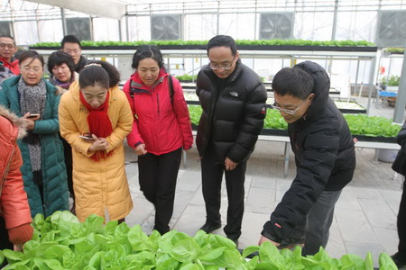 走进温室展示区,大家依次参观了农业科研成果和设施展示区、移动式食用菌工厂、人工光植物工厂、叶菜工厂、果菜工厂、都市园艺馆、绿色创意馆等、植物工厂展示区,讲解员详细介绍了目前无土水培蔬菜的现状和取得的科技成果,无土水培技术的基本原理,以及“水”、“肥”、“气”、“热”如何对农作物品质产生影响。之后,园区种植专家具体培训了传统土壤种植技术和无土栽培技术各自的特点、优势和营养成分差异等常识,科普了传统“大棚蔬菜”、“绿色蔬菜”和“有机蔬菜”在概念和含义上的不同,还对日常生活中挑选蔬菜的注意事项做了介绍,并与大家进行了现场交流和互动。
