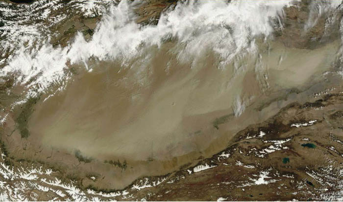 在一个正在经历温室变暖的世界中,一些发现变化会在你的意料之中,但在青藏高原,一些区域因素加剧了这种变化。这一地区的沙漠在夏季卷起风沙,迎着高原沿南北坡向上运输。根据近期的一项卫星观测,高原上空存在从塔克拉玛干大沙漠吹来的沙尘。兰州大学的黄建平说:“在高原上发现如此巨量的沙尘,连我们自己都很惊奇。”沙尘层输送到高达
